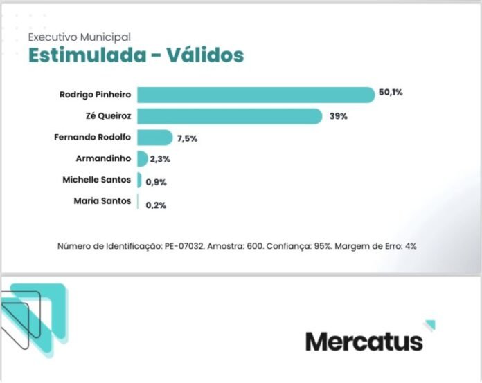 A pesquisa estimulada aponta Rodrigo Pinheiro com 44,3% dos votos seguido de José Queiroz com 34,5%. Em terceiro Fernando Rodolfo com 6,6% ; Armandinho com 2%; Michelle com 0,8%; Maria com 0,2%; Branco com 6,2%, Indecisos com 5,4%.