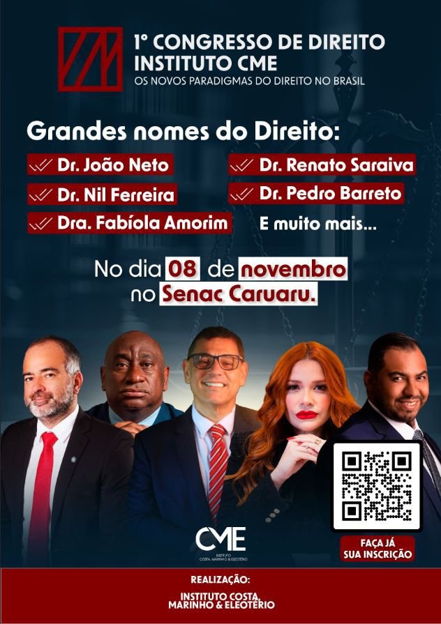“Caruaru será palco de um evento que vai reunir palestrantes renomados de todo o Brasil! Serão momentos de muito aprendizado, networking e troca de experiências que vão transformar sua carreira jurídica”, antecipou o presidente do Instituto CME Caruaru, Lucas Costa.
