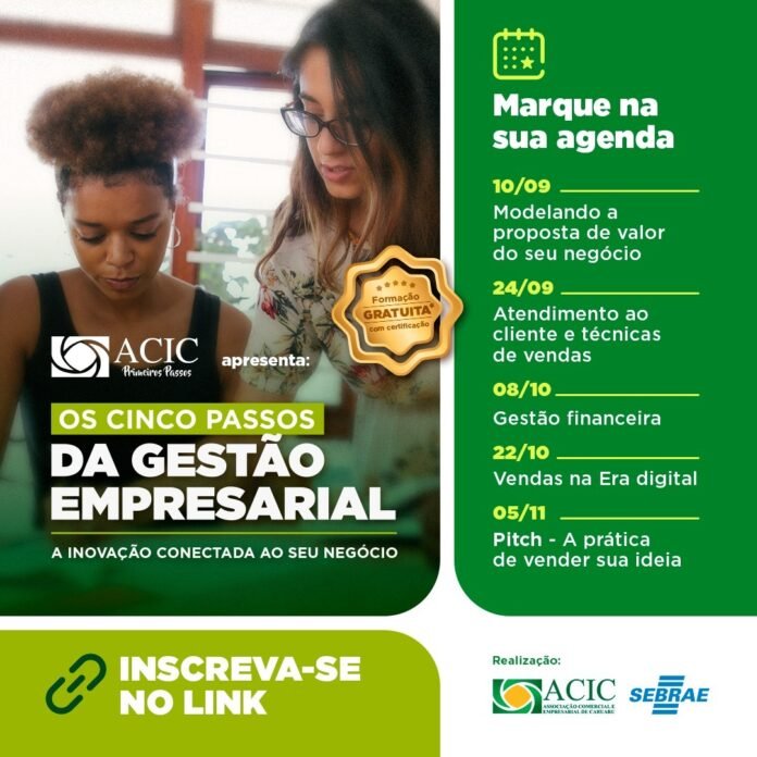 A Associação Comercial e Empresarial de Caruaru (Acic) está com inscrições abertas para a 9ª turma do Núcleo Primeiros Passos, com aulas que serão realizadas de forma gratuita entre os meses de setembro e novembro. Com o tema “Os Cinco Passos da Gestão Empresarial – A inovação conectada ao seu negócio”, a capacitação é voltada para empreendedores que procuram aperfeiçoar e fortalecer sua gestão empresarial. Microempreendedores (MEI) e microempresas (ME) de qualquer ramo de atividade podem participar, desde que tenham até cinco anos de existência e que sejam associados à Acic.