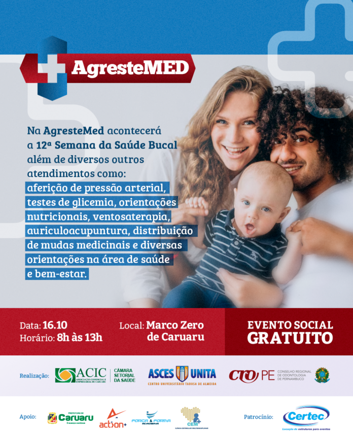 A Câmara Setorial de Saúde da Associação Comercial e Empresarial de Caruaru (Acic), após quatro anos, voltará a realizar a AgresteMed, juntamente com Conselho Regional de Odontologia de Pernambuco (CRO-PE) e o Centro Universitário Tabosa de Almeida (Asces-Unita). A sexta edição do evento social gratuito acontecerá no Marco Zero de Caruaru, no dia 16 de outubro, das 8h às 13h, juntamente com a 12ª Semana da Saúde Bucal. Juntos, os projetos vão oferecer orientações de escovação, atendimento psicológico, avaliação antropométrica e nutricional, teste de glicemia, exames de prevenção ao câncer bucal, entre outras ações.
