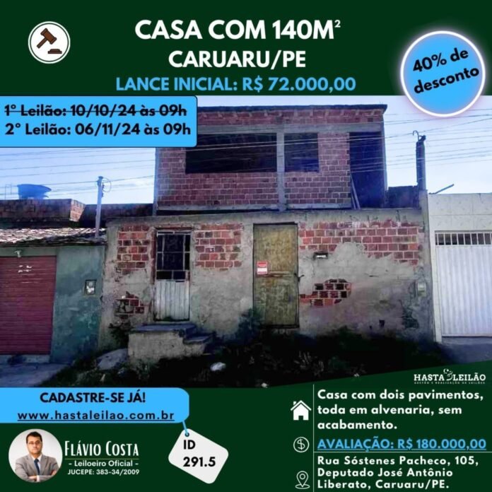 📍 Localização do bem: Situado na Rua Sóstenes Pacheco, 105, Deputado José Antonio Liberato, Caruaru-PE