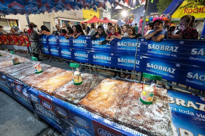 A terça-feira (18) foi dia de celebrar o Maior Bolo de Macaxeira do Mundo e a Mata-fome Gigante, nos bairros Divinópolis e São João da Escócia, respectivamente. Nesta quarta (19), às 19h, as Comidas Gigantes do Maior e Melhor São João do Mundo serão o Maior Bolo de Fubá e o Péla-Jegue, nos bairros Nossa Senhora das Dores e Salgado.