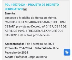O PDL de n.º 1957/2024 é de autoria do Parlamentar Professor Jorge Quintino e dá outras providências.