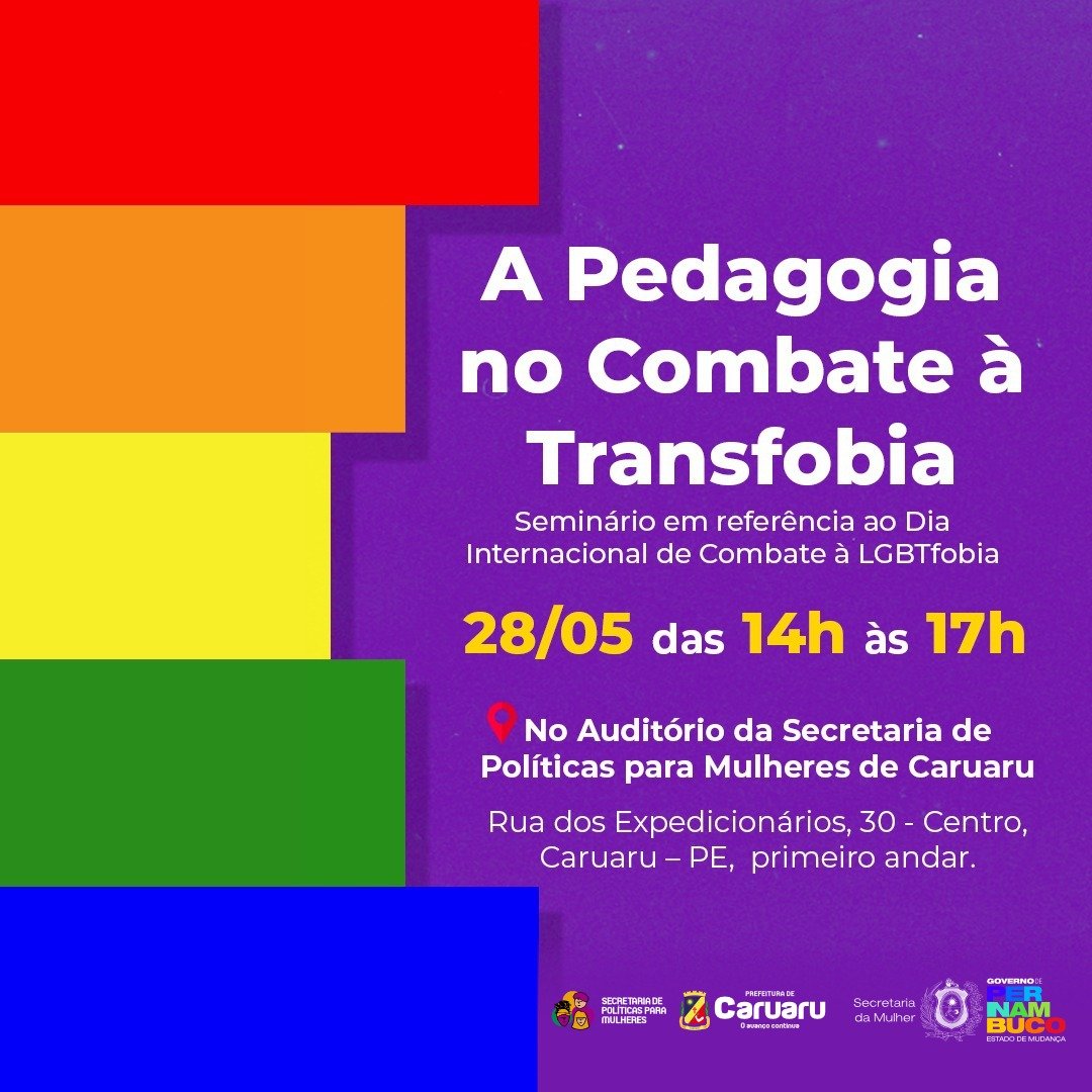 A Prefeitura de Caruaru, por meio da Secretaria de Políticas para Mulheres, convida todos para o seminário “A Pedagogia no Combate à Transfobia”. O evento, promovido pelo Governo do Estado de Pernambuco, será realizado nesta terça-feira (28), às 14h, no auditório da Secretaria de Políticas para Mulheres do município, localizado na Rua dos Expedicionários, nº 30, Centro.