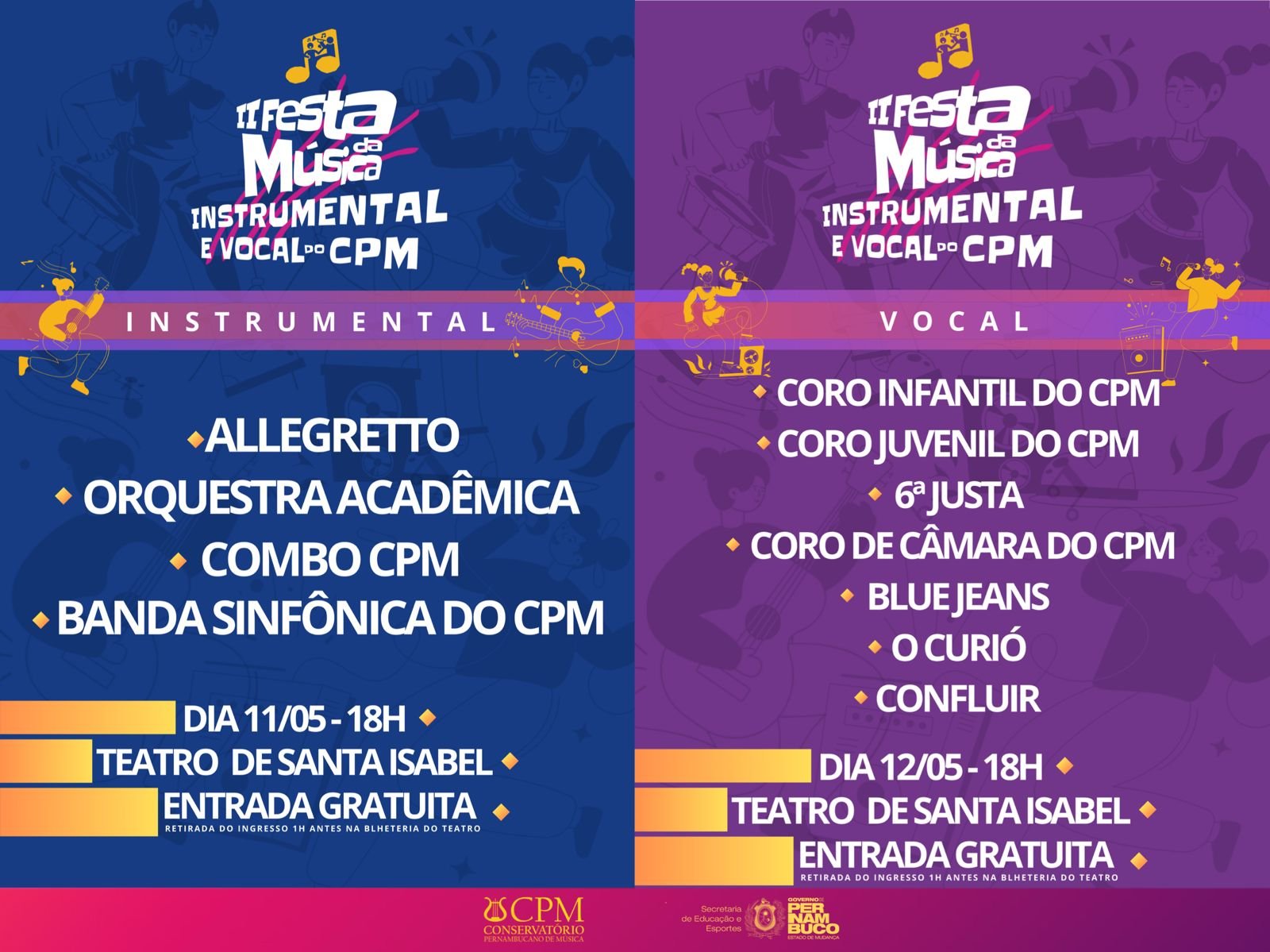 “É com grande alegria que convidamos toda a sociedade para assistir mais um grande evento musical de alta qualidade e bastante diversificado, promovido pelo Conservatório Pernambucano de Música. A Festa da Música Instrumental e Vocal do CPM contará com dois dias de apresentações dedicadas à promoção musical de grupos da nossa instituição”, destaca a gerente geral do CPM, Janete Florêncio.