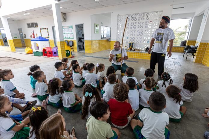 O Projeto “O Gingar da Capoeira com a Educação Infantil” foi realizado, na manhã desta segunda-feira (21), no CMEI Pinheirão, no bairro São José. Desenvolvida pelo Centro de Prática e Pesquisa N’ Golo Capoeira, em parceria com a Secretaria de Educação e Esportes de Caruaru e o Projeto Capoeira com a UFPE, a iniciativa tem como objetivo apresentar a cultura afro-brasileira, incluindo, a trajetória da capoeira Angola, a partir de brincadeiras, jogos musicais e contações de histórias.