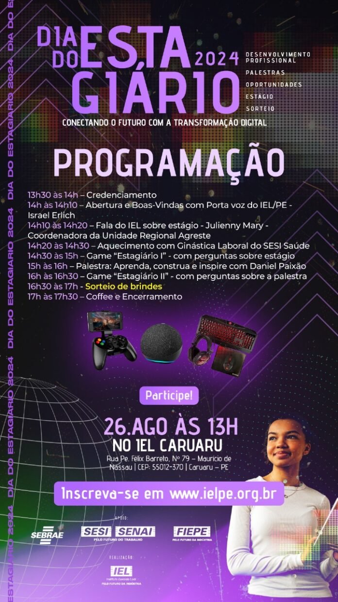 Em parceria com a Federação das Indústrias do Estado de Pernambuco (FIEPE) e o Sebrae-PE, o evento terá um momento de ginástica laboral oferecido pelo Serviço Social da Indústria de Pernambuco (SESI-PE), duas edições do “Game Estagiário”, um quiz com perguntas sobre essa fase de experiência e outro com questionamentos sobre a palestra: “Aprenda, Construa e Inspire”, com o especialista Daniel Paixão. Os estudantes poderão tirar dúvidas sobre o processo de estágio e de como aproveitar o período para ingressar no mercado de trabalho. No final da programação, eles concorrerão a uma Alexa, um controle gamer para celular e outros brindes e poderão degustar um coffee break.