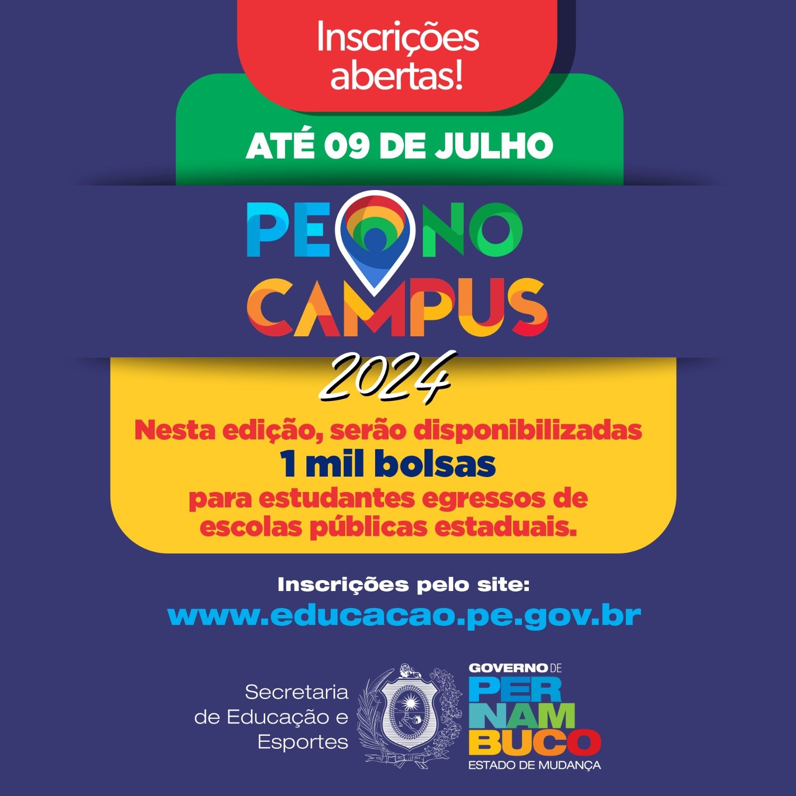 As inscrições para o programa PE no Campus 2024 estão abertas. A iniciativa tem o objetivo de estimular o acesso e a permanência de estudantes de baixa renda nas instituições de ensino superior das redes públicas estadual e federal de ensino superior localizadas em todo o território nacional. Nesta edição, serão disponibilizadas 1 mil bolsas para estudantes egressos de escolas públicas estaduais. Os interessados deverão se inscrever pelo site www.educacao.pe.gov.br, até o dia 09 de julho.