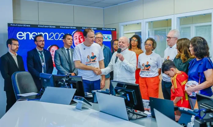 Lula visitou a sala de monitoramento do Enem acompanhado dos ministros da Educação Camilo Santana, e da Saúde, Nísia Trindade, chefe das Relações Institucionais, Alexandre Padilha, e do presidente do Inep, Manuel Palácios, além da primeira-dama Janja Lula.
