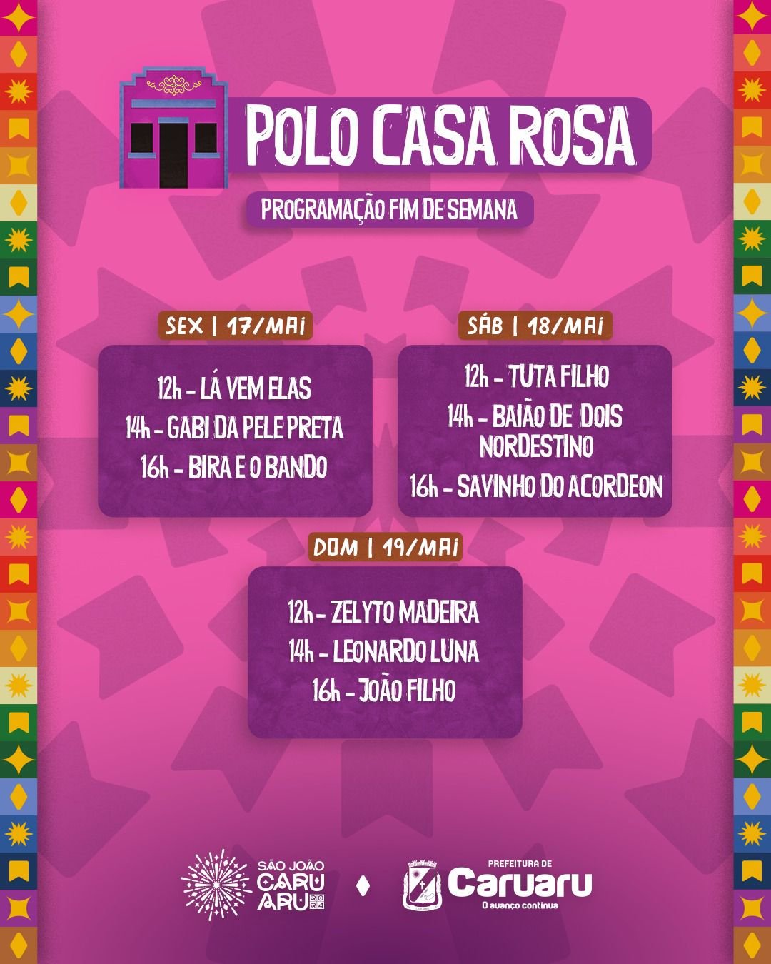A programação do Maior e Melhor São João do Mundo continua no Mercado Cultural Casa Rosa. As atrações do festejo junino irão se apresentar durante os meses de maio e junho, levando muito forró para o coração da Feira de Caruaru.