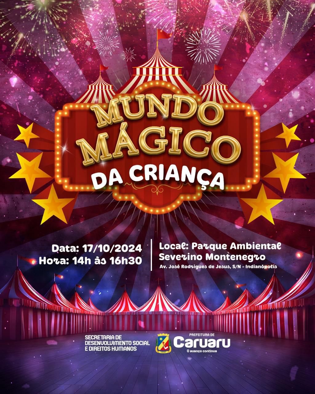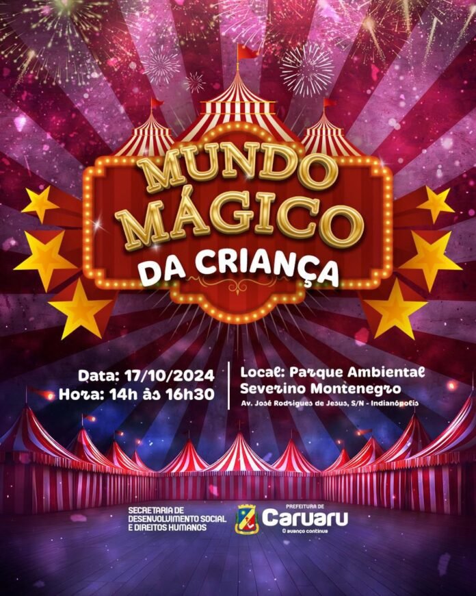 A Prefeitura de Caruaru, por meio da Secretaria de Desenvolvimento Social e Direitos Humanos (SDSDH), em parceria com o Serviço de Convivência e Fortalecimento de Vínculos (SCFV), realizará, no dia 17 de outubro de 2024, das 14h às 16h30, no Parque Ambientalista Severino Montenegro, uma celebração especial em comemoração ao Dia das Crianças.