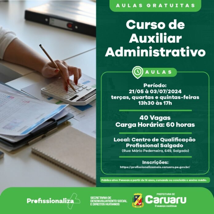 A Prefeitura de Caruaru, por meio da Secretaria de Desenvolvimento Social e Direitos Humanos (SDSDH), em parceria com com a Secretaria de Desenvolvimento Econômico e Economia Criativa (SEDETEC) e Programa Profissionaliza + Caruaru, ofertará o curso de Auxiliar Administrativo, que tem como intuito oferecer base sólida de conhecimentos práticos necessários para desempenhar as funções de auxiliar administrativo, tais como: organização de documentos, atendimento ao cliente, uso de softwares de escritório, entre outros. As habilidades aprendidas no curso são aplicáveis em uma variedade de setores, desde empresas privadas até organizações do setor público, o que amplia as oportunidades de emprego.