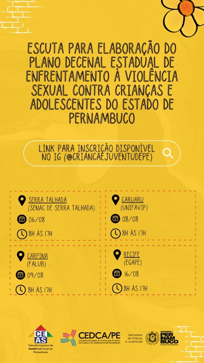 Entre os dias 06 a 16 de agosto, a Secretaria de Criança e Juventude de Pernambuco (SCJ-PE), que coordena a comissão de construção do Plano Decenal de Enfrentamento à Violência Sexual contra Crianças e Adolescentes de Pernambuco, irá articular uma série de escutas presenciais em todas as regiões do estado. As paradas serão nos municípios de Serra Talhada, no Sertão; Caruaru, no Agreste; Carpina, na Zona da Mata; e no Recife, com o intuito de elaborar o documento. A iniciativa visa mobilizar, em parceria com o Conselho Estadual dos Direitos da Criança e do Adolescente (Cedca), profissionais que compõem a rede de proteção, a sociedade civil e comunidade no geral em torno da temática, além de contar com a participação ativa dos adolescentes na formulação de propostas de ações para o documento.