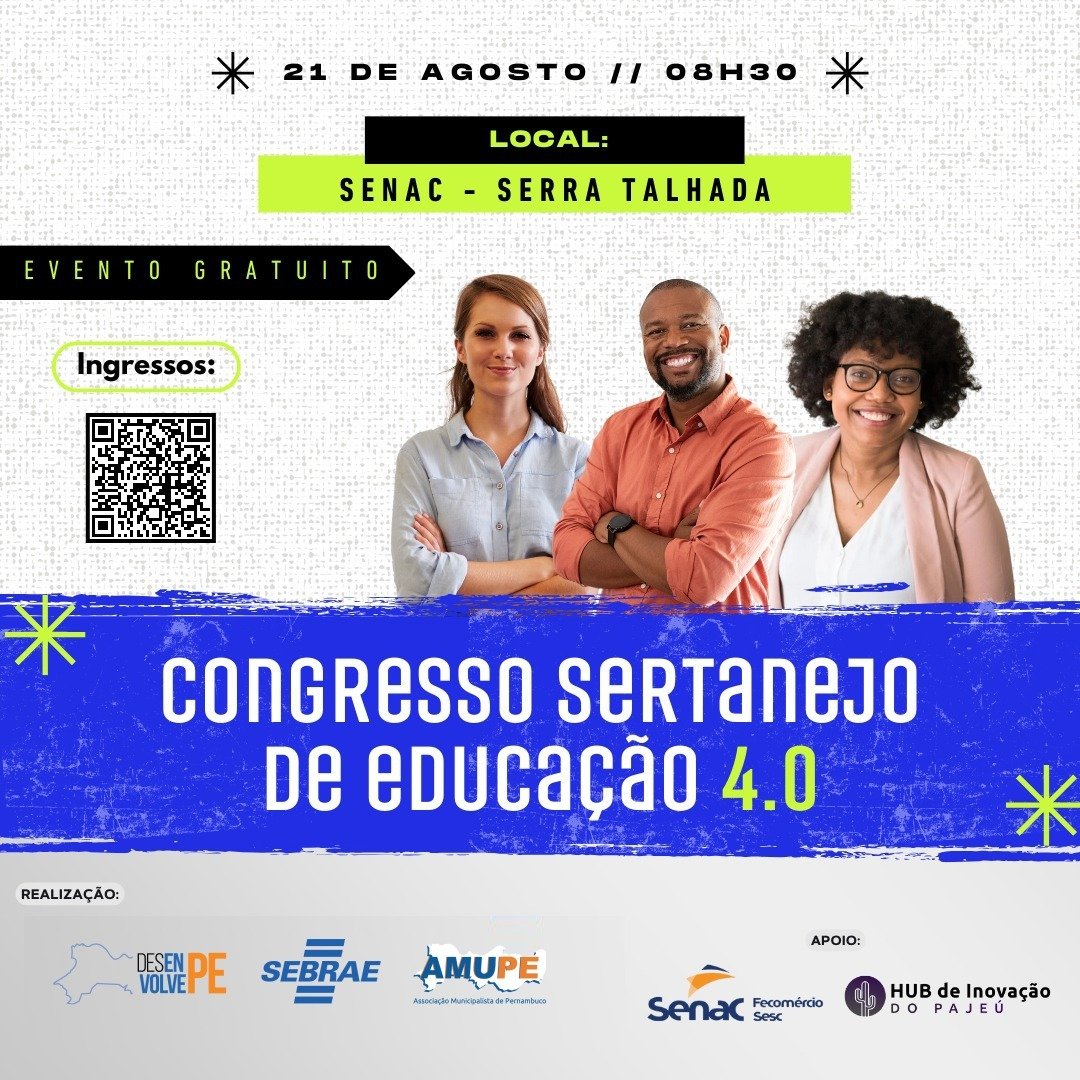 Um evento inédito que vai reunir especialistas da área do ensino para debaterem sobre o futuro da educação no Brasil e em nosso Estado está chegando ao Sertão pernambucano. Voltado para professores, gestores escolares e secretários municipais de educação, o 1º Congresso Sertanejo de Educação 4.0 está com inscrições abertas. O seminário acontecerá no dia 21 de agosto, das 08h30 às 17h00, no Senac do município de Serra Talhada, no Sertão do Pajeú.