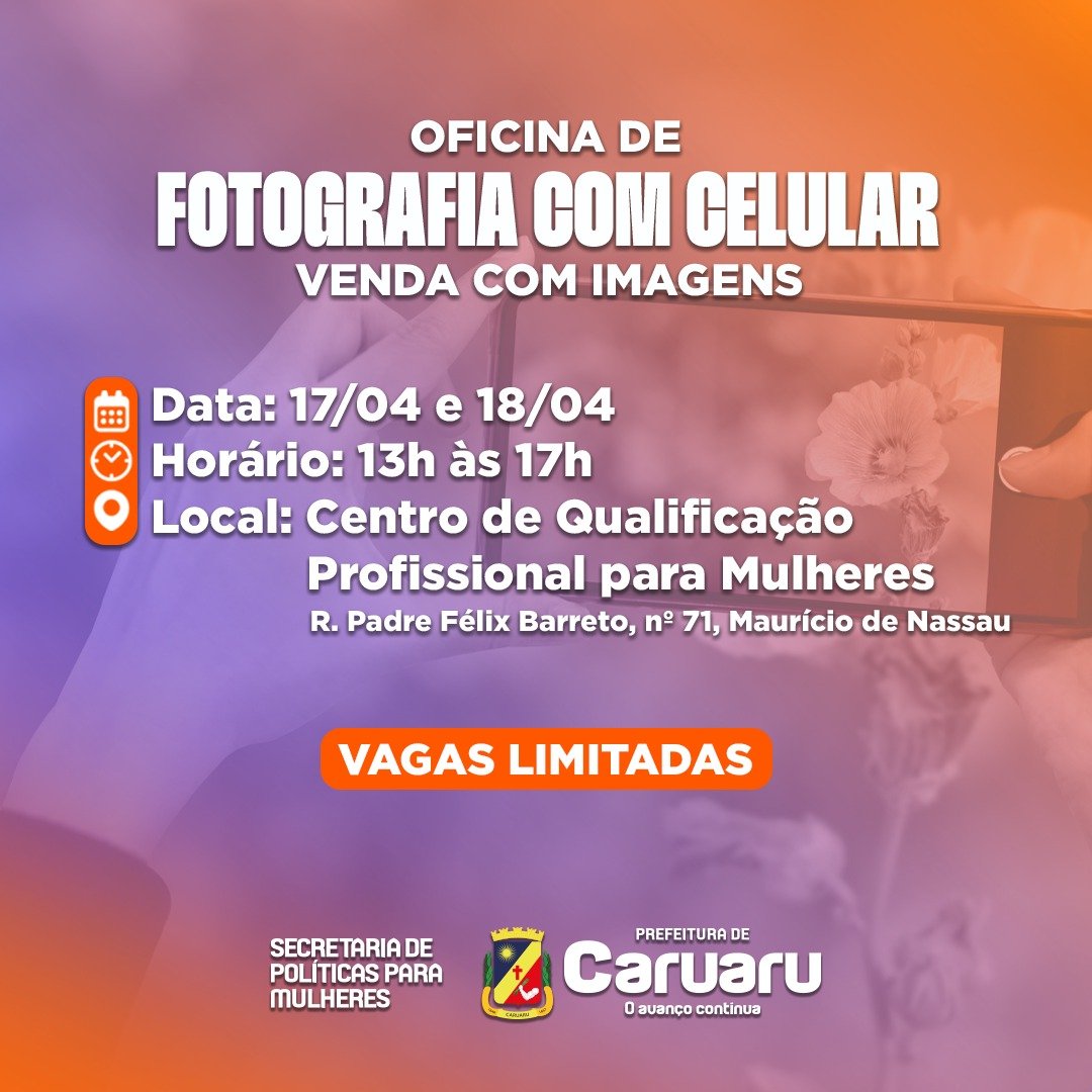 A Secretaria de Políticas para Mulheres, por meio do Centro de Qualificação Profissional para Mulheres (CQP), está com inscrições abertas para a oficina de fotografia com celular: venda com imagens, que terá início na próxima quarta-feira (17), na sede do CQP.