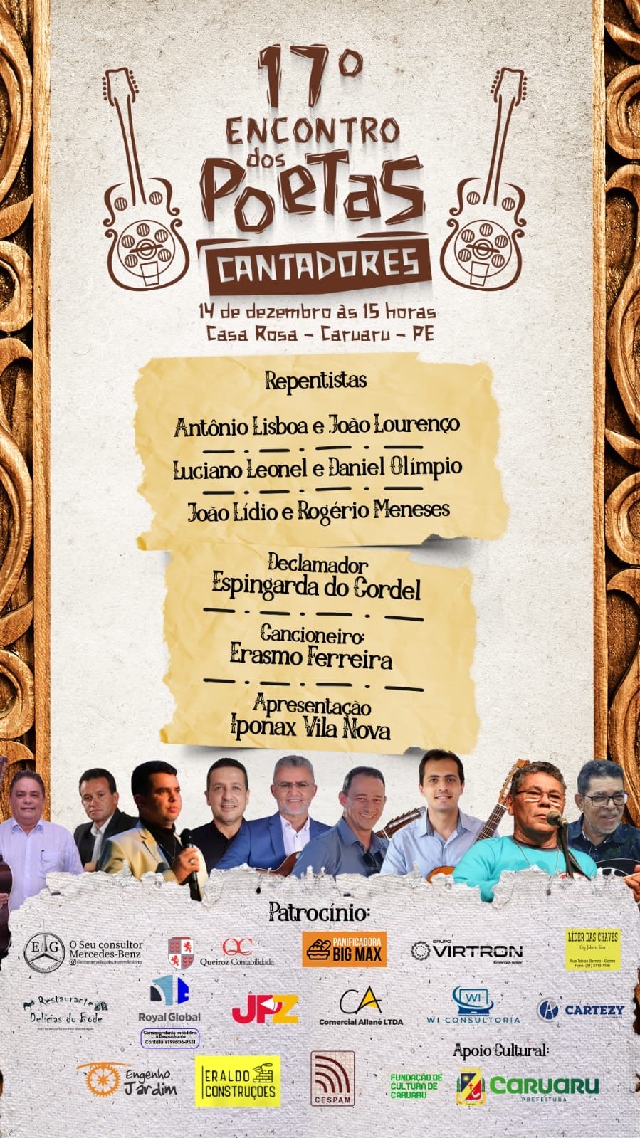 Poesias, repentes e canções farão parte do 17º Encontro dos Poetas Cantadores, que será realizado no domingo (14 de dezembro), a partir das 15h. O evento será gratuito, no Mercado Cultural Casa Rosa, localizada no Parque 18 de Maio, em Caruaru.