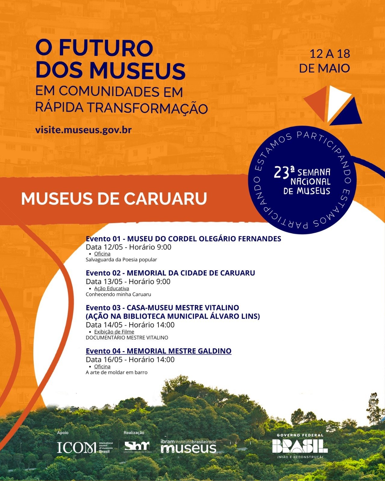 Caruaru sediará, a partir da próxima segunda-feira (12), uma programação temática em homenagem à 23ª Semana Nacional dos Museus. As atividades, que seguirão até a sexta-feira (16), acontecerão em quatro espaços da cidade: o Museu do Cordel Olegário Fernandes, o Memorial de Caruaru, a Biblioteca Municipal Álvaro Lins e o Memorial Mestre Galdino.