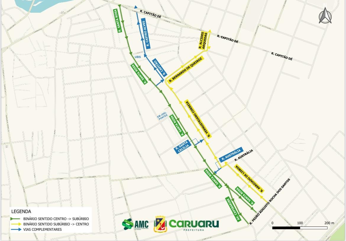 A Prefeitura de Caruaru, por meio da Autarquia de Mobilidade de Caruaru (AMC), informa que, a partir desta quinta-feira (20), entrará em vigor um novo binário de circulação no bairro Santa Rosa. A medida tem como objetivo aumentar a segurança viária e melhorar a fluidez do tráfego, beneficiando tanto condutores quanto pedestres.