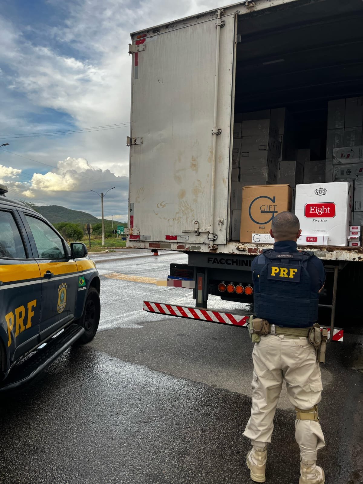 Durante uma fiscalização de combate à alcoolemia, policiais abordaram um caminhão baú ocupado apenas pelo motorista. Ao abrir o compartimento de carga do veículo, encontraram 600 caixas de cigarros proibidos de serem comercializados no Brasil.