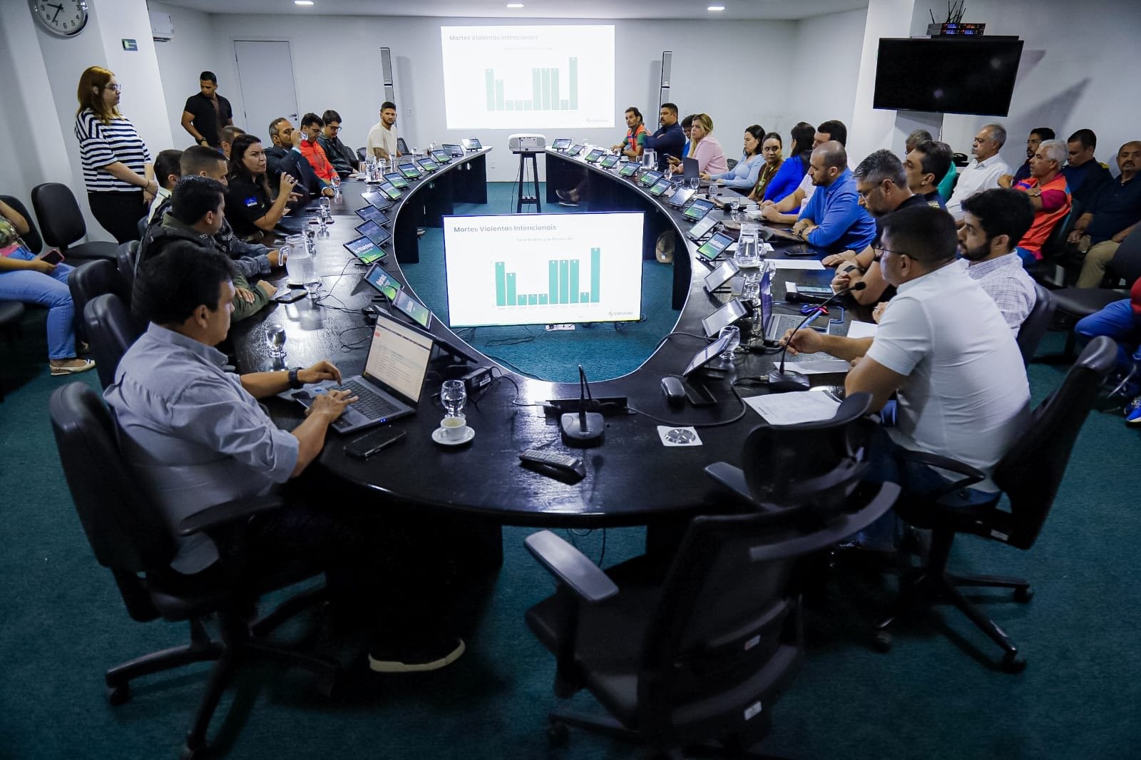 A Prefeitura de Caruaru realizou, nesta quarta-feira (19), na Sala de Monitoramento, mais uma reunião da Câmara Intersetorial de Segurança. Participaram representantes das polícias, Corpo de Bombeiros e diversas secretarias municipais, que acompanharam a apresentação dos indicadores atualizados de criminalidade.