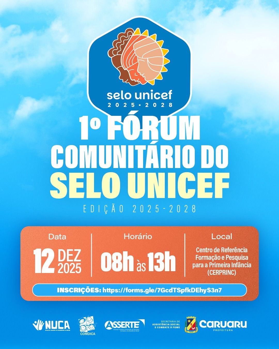 A Prefeitura de Caruaru, por meio da Secretaria de Assistência Social e Combate à Fome (SAS), realizará nesta sexta-feira , dia 12 de dezembro, o Fórum Comunitário do Selo UNICEF – Edição 2025-2028. O evento acontecerá das 8h às 13h, no Centro de Referência, Formação e Pesquisa para a Primeira Infância (CERPRINC). As inscrições seguem disponíveis pelo link: https://forms.gle/7GcdTSpfkDEhyS3n7.