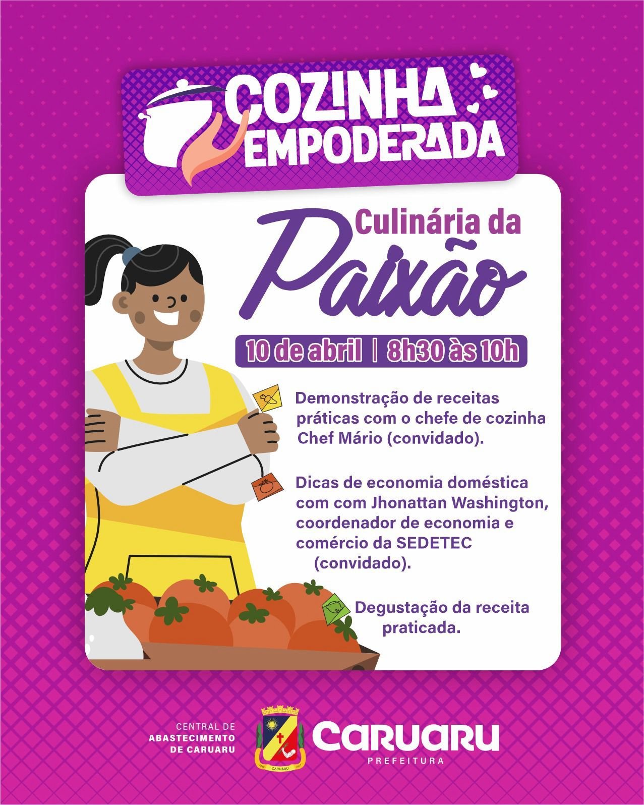 Os cursos serão ministrados pelo Chef Mário (Demonstração de receitas práticas) e pelo coordenador de economia e comércio da SEDETEC, Jhonattan Washington (Dicas de economia doméstica). Para mais informações e inscrições, basta entrar em contato pelo telefone 81.98945-4151.