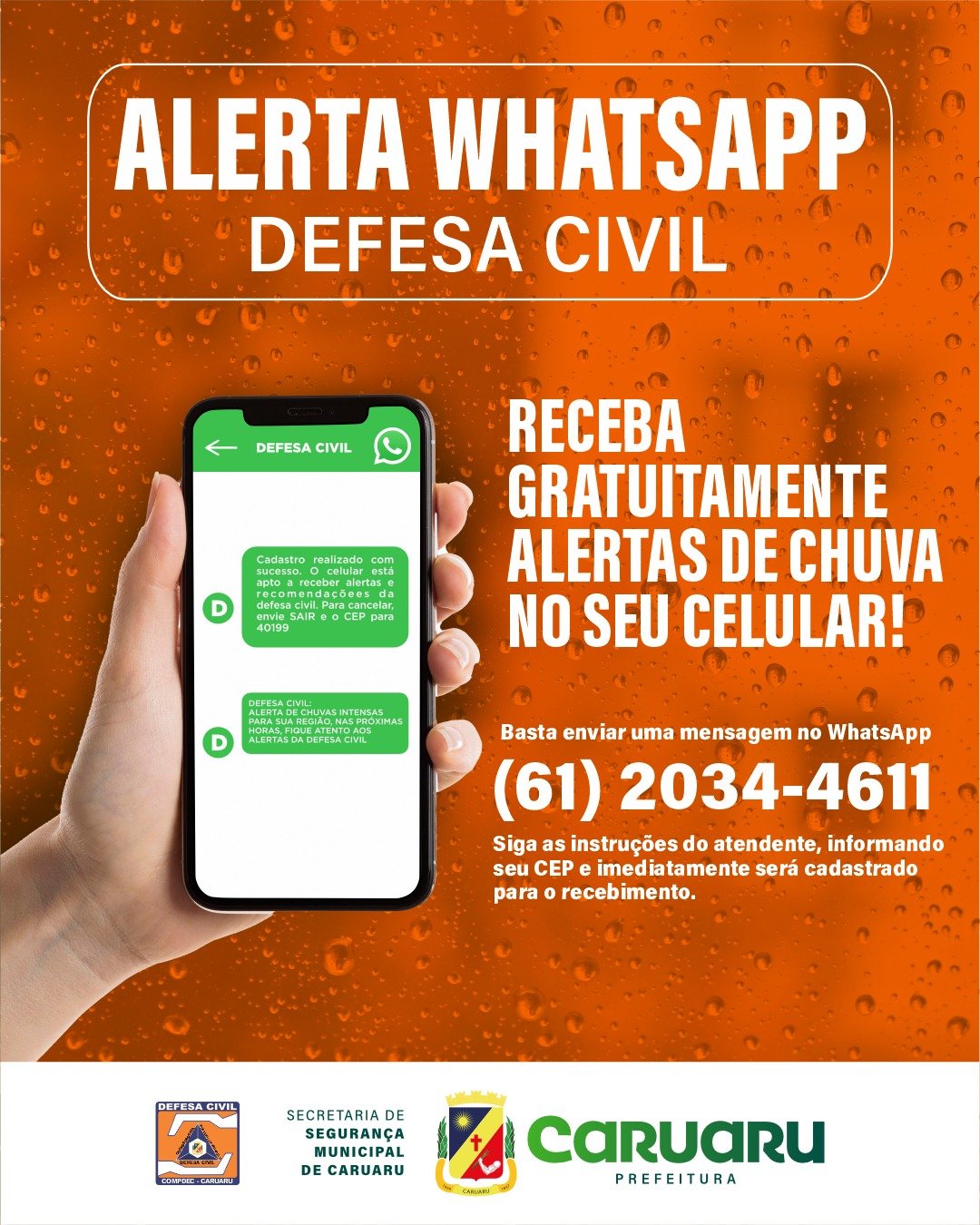 A Prefeitura de Caruaru, por meio da Defesa Civil, está reforçando junto à população a importância de se cadastrar no serviço de alerta via WhatsApp da Defesa Civil Nacional. A iniciativa é gratuita e tem como objetivo enviar notificações sobre chuvas intensas e outros eventos meteorológicos diretamente no celular dos moradores da cidade.