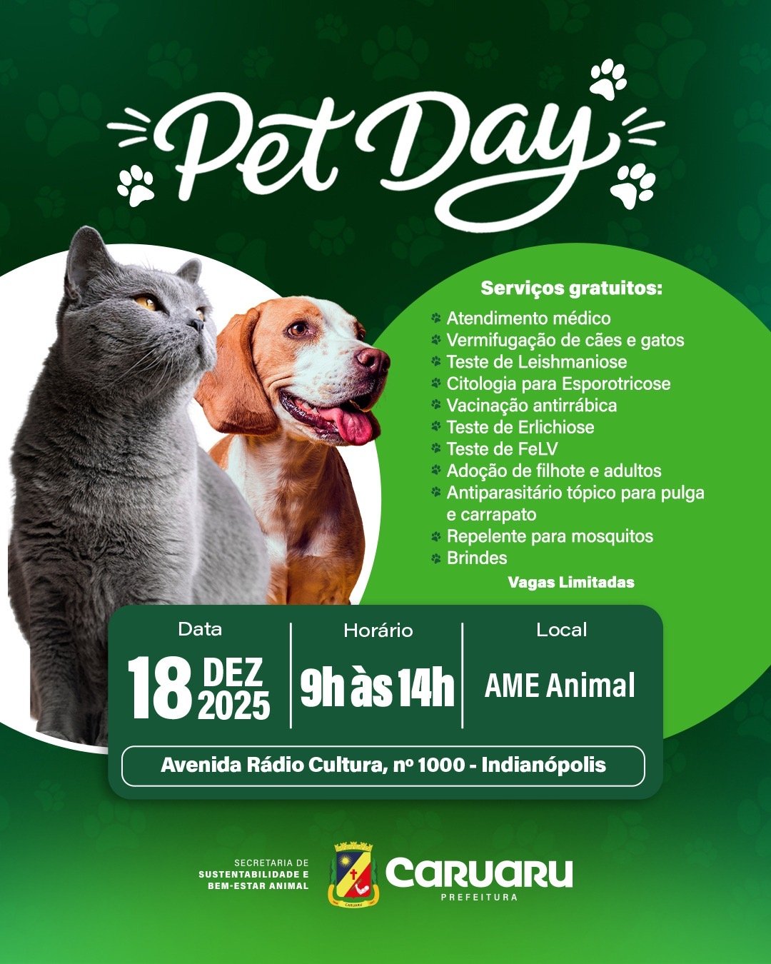 O Pet Day foi criado para ampliar o acesso aos cuidados com a saúde animal, reunindo, em um único dia, atendimentos, vacinação e exames que auxiliam na prevenção, diagnóstico e tratamento de cães e gatos. A ação ocorrerá das 9h às 14h, na AME Animal, localizada na Av. Rádio Cultura, nº 1000, bairro Indianópolis. As vagas são limitadas e distribuídas por ordem de chegada.