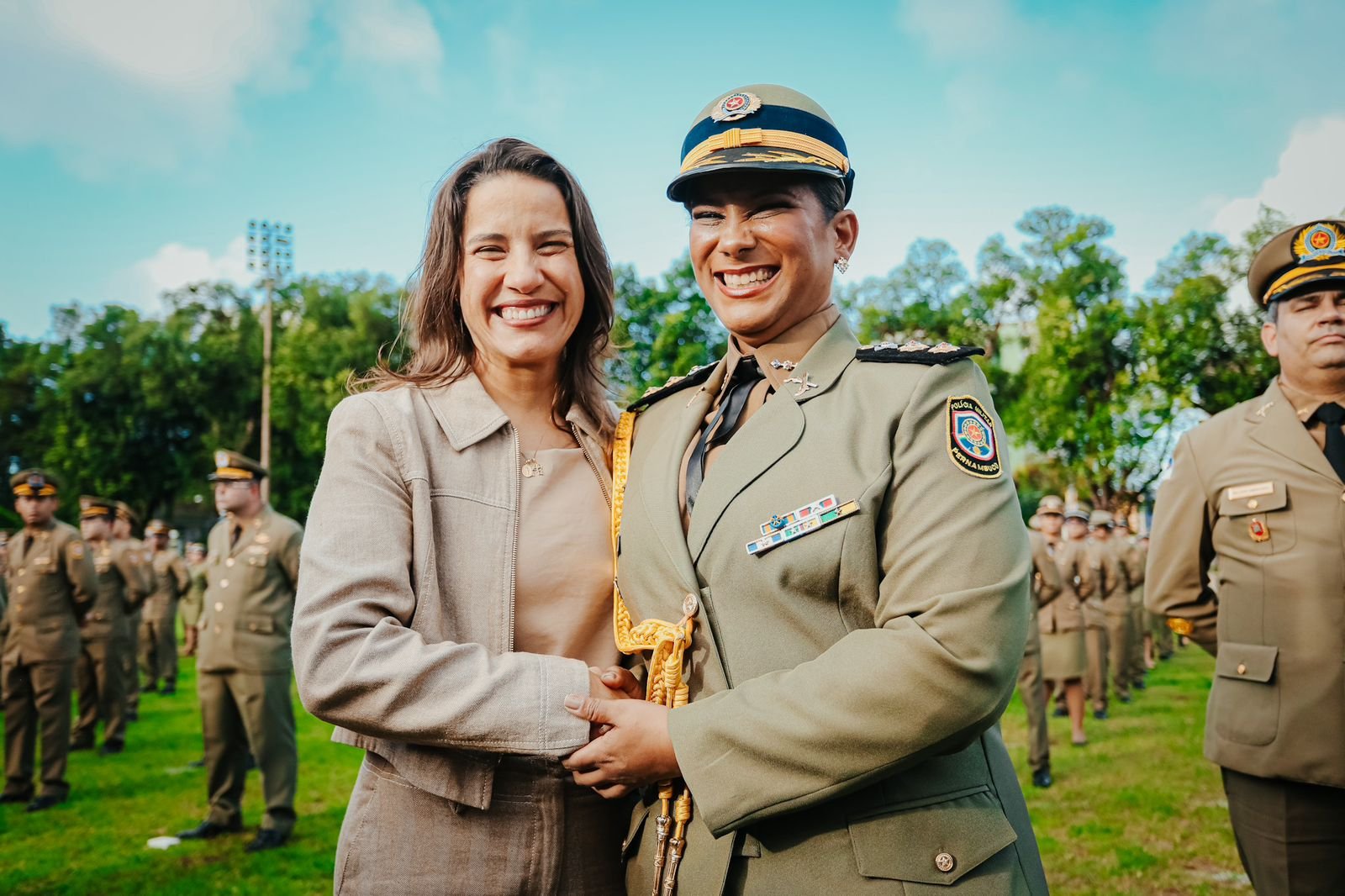 Durante a solenidade, a governadora e a vice-governadora comandaram também a entrega simbólica de insígnias a 854 oficiais e praças recém-promovidos em Pernambuco, que ascenderam a novos postos e graduações. A cerimônia integra a programação oficial dos 200 anos de criação da PMPE e simboliza o reconhecimento ao mérito, à dedicação e ao compromisso dos servidores com a segurança da população.