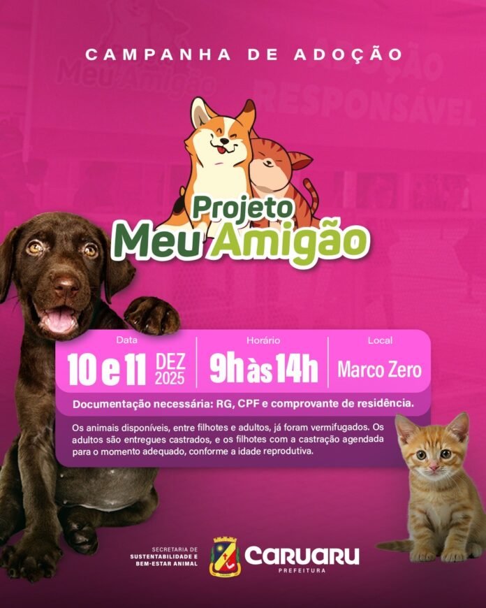 O projeto “Meu Amigão”, que promove adoção responsável de cães e gatos resgatados pela AME Animal, realiza mais uma edição nesta quarta (10) e quinta-feira (11), das 9h às 14h, no Marco Zero. A ação da Secretaria de Sustentabilidade e Bem-Estar Animal (SSB) terá médicos veterinários no local, orientando os novos tutores sobre os cuidados com os pets.