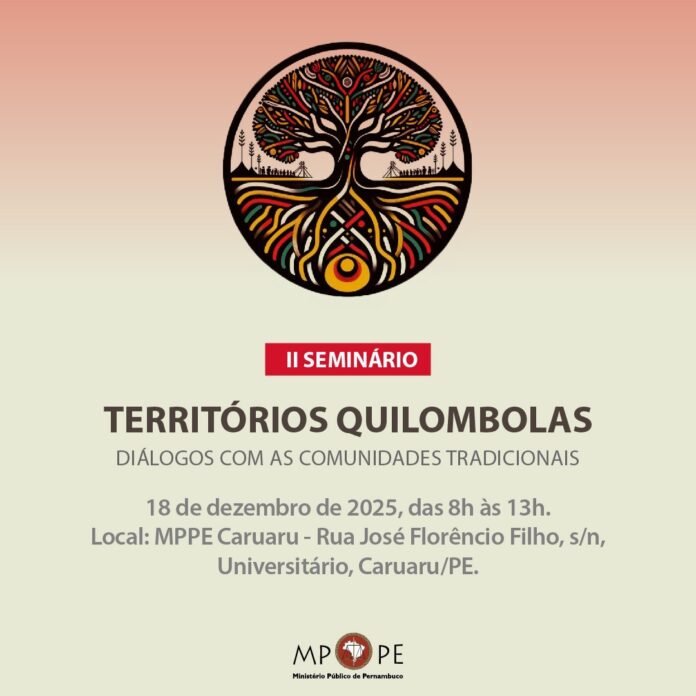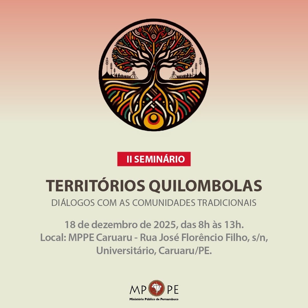 O Ministério Público de Pernambuco (MPPE), por meio da 6ª Promotoria de Justiça de Defesa da Cidadania de Caruaru, realizará o II Seminário “Territórios Quilombolas: Diálogos com as Comunidades Tradicionais”, reafirmando seu compromisso com a promoção dos direitos humanos e o fortalecimento das políticas públicas voltadas às comunidades tradicionais.