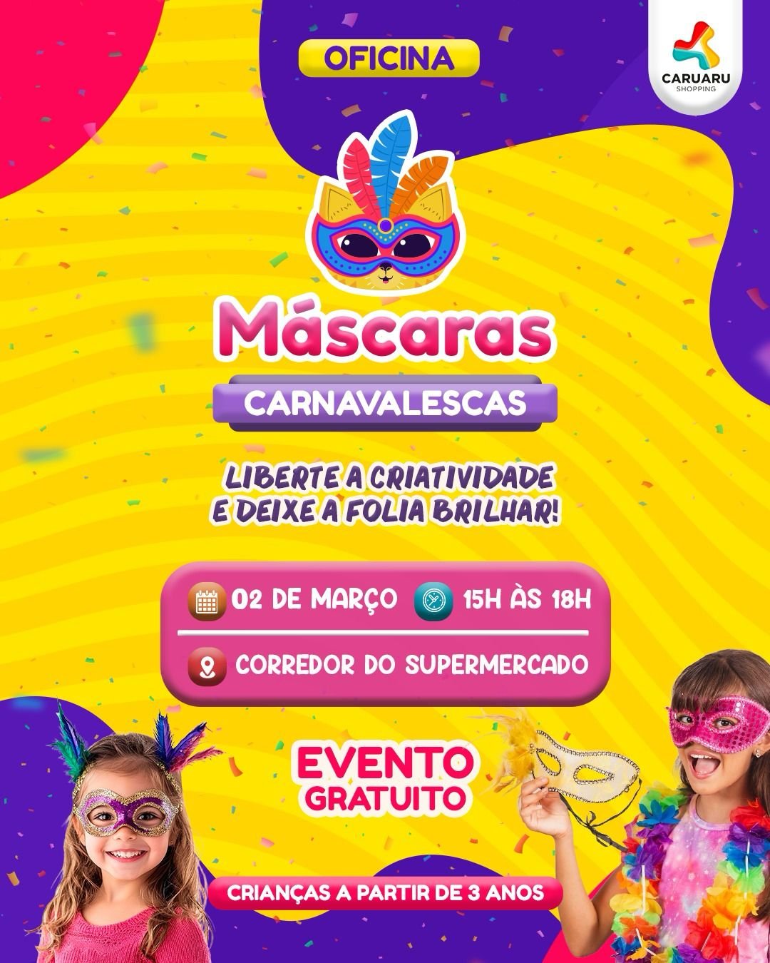 O Caruaru Shopping estará realizando, no dia 2 de março, a Oficina de Máscaras Carnavalescas, para crianças a partir dos três anos de idade. A atividade acontecerá no corredor do supermercado, das 15h às 18h.