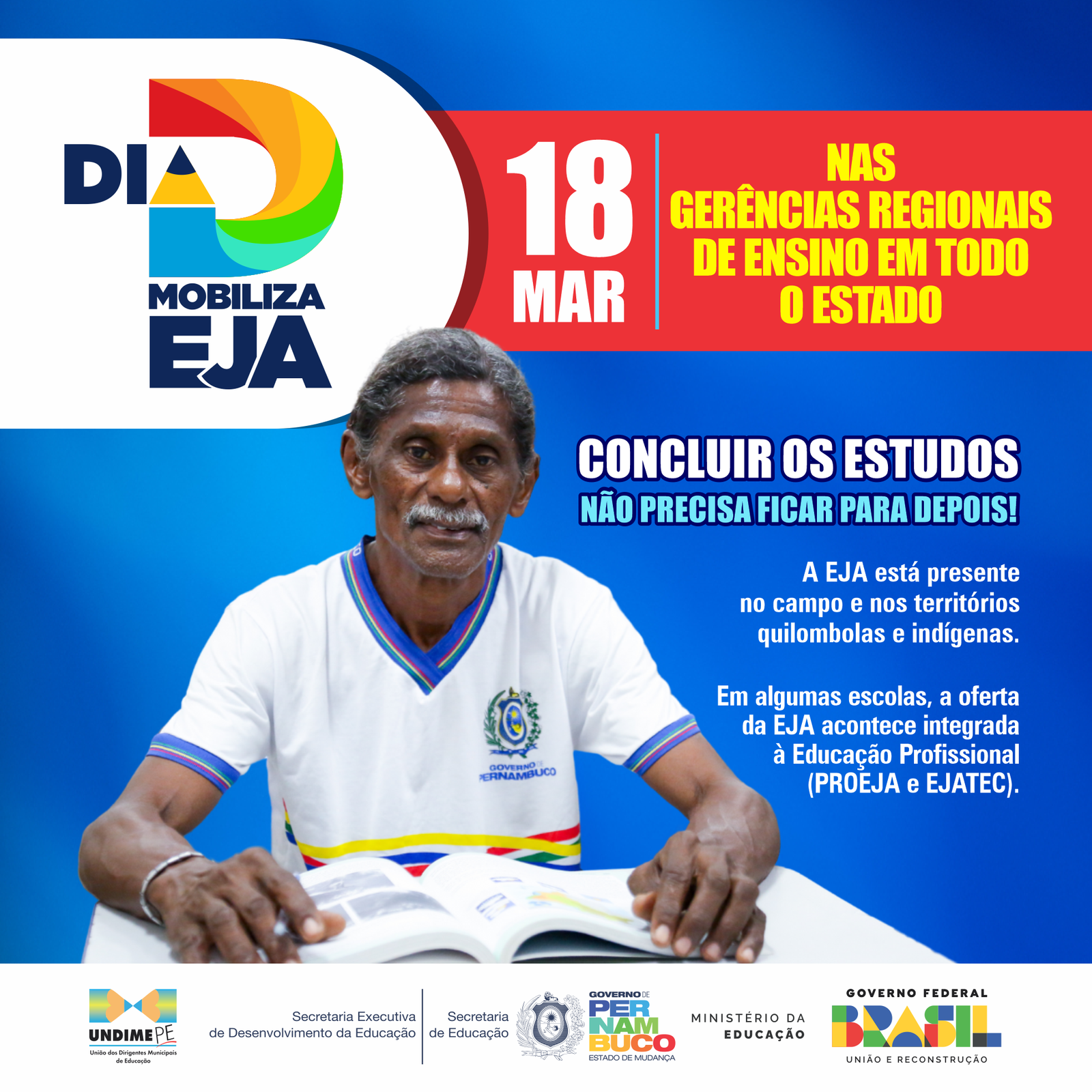 Pernambuco vai receber o movimento Dia D: Mobiliza EJA. A ação vai acontecer, nesta terça-feira (18), simultaneamente em todas as 16 Gerências Regionais de Ensino da Secretaria de Educação do Estado de Pernambuco (SEE), sendo um marco para a mobilização, conscientização e a expansão da oferta da educação para quem está fora da escola. A iniciativa vai abranger todos os 184 municípios e contará com a distribuição de folders explicativos para os jovens, adultos e idosos que ainda não concluíram o ensino fundamental ou médio.