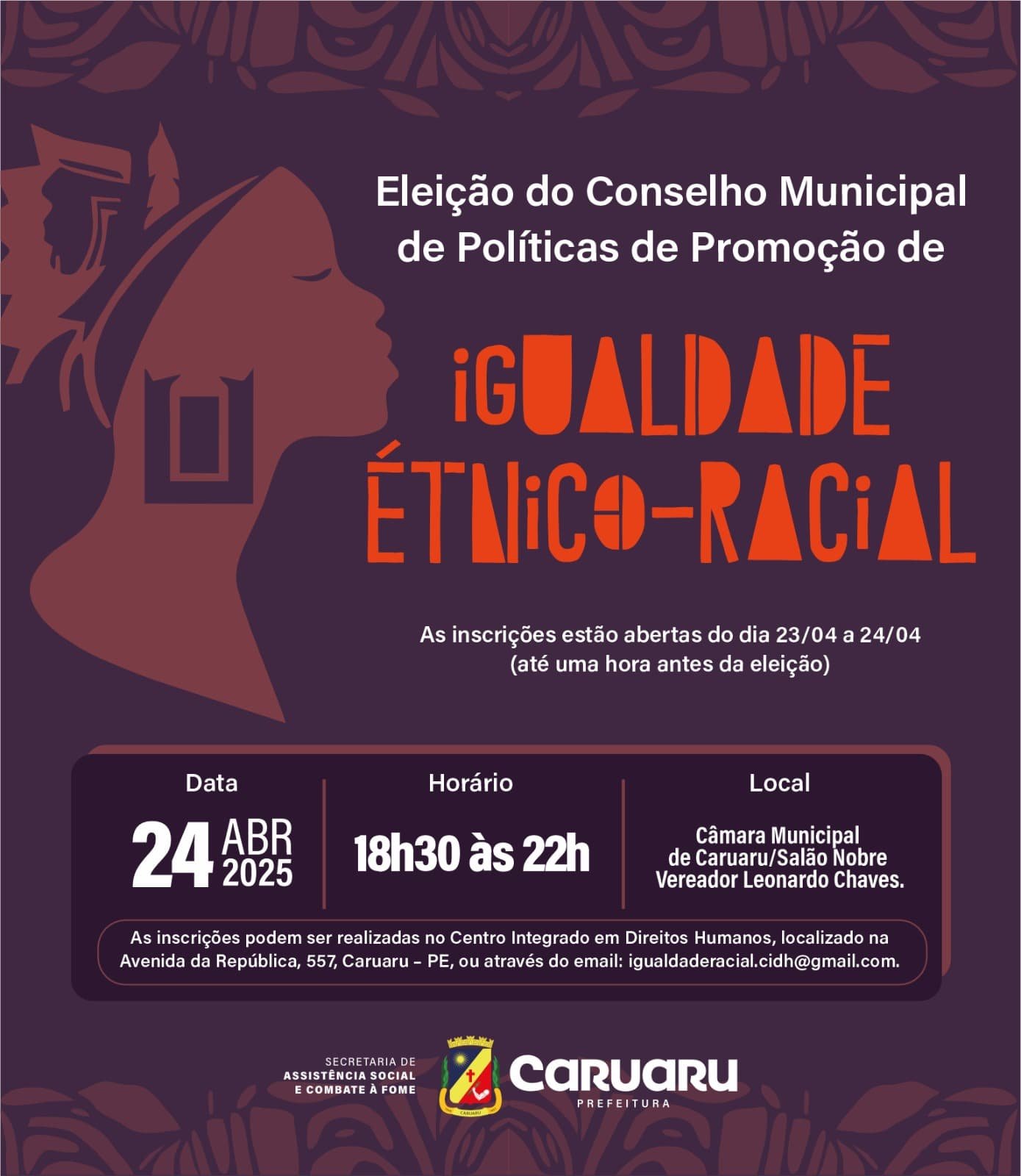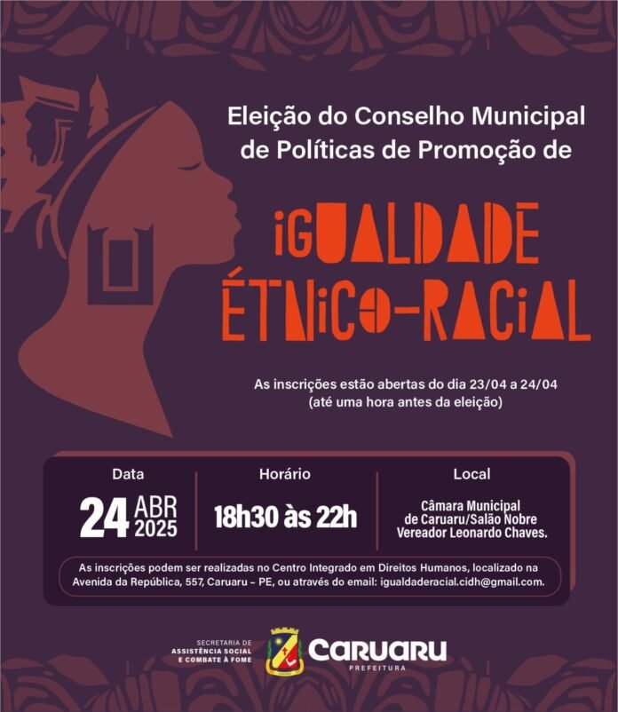 A Prefeitura de Caruaru, por meio da Secretaria de Assistência Social e Combate à Fome e do Conselho de Políticas de Promoção da Igualdade Étnico-Racial (COPPIR), torna público o processo eleitoral para a escolha dos novos representantes da sociedade civil organizada no Conselho Municipal de Promoção da Igualdade Étnico-Racial, referente ao biênio 2025-2026.