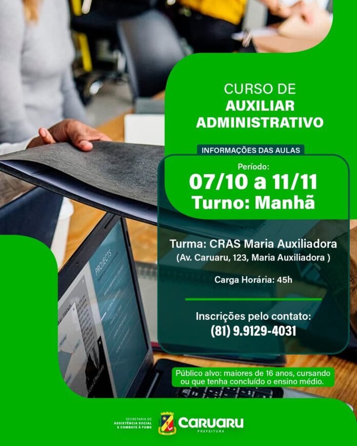 A Prefeitura de Caruaru, por meio da Secretaria de Desenvolvimento Econômico, Turismo, Tecnologia e Economia Criativa (SEDETEC), em parceria com a Secretaria de Assistência Social e Combate à Fome (SAS), está com inscrições abertas para o curso gratuito de Auxiliar Administrativo, promovido pelo Programa Profissionaliza Mais.