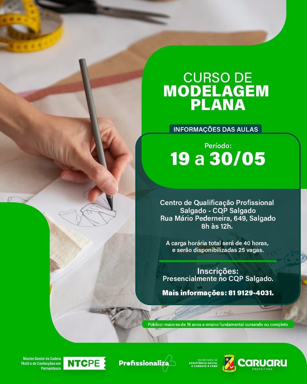 A Prefeitura de Caruaru, por meio da Secretaria de Assistência Social e Combate à Fome (SAS), em parceria com a Secretaria de Desenvolvimento Econômico e Economia Criativa (SEDETEC) e o Núcleo Gestor da Cadeia Têxtil e de Confecções em Pernambuco (NTCPE), está com inscrições abertas para o curso gratuito de Modelagem Plana, voltado para quem deseja ingressar ou se aperfeiçoar no setor da moda e da confecção.