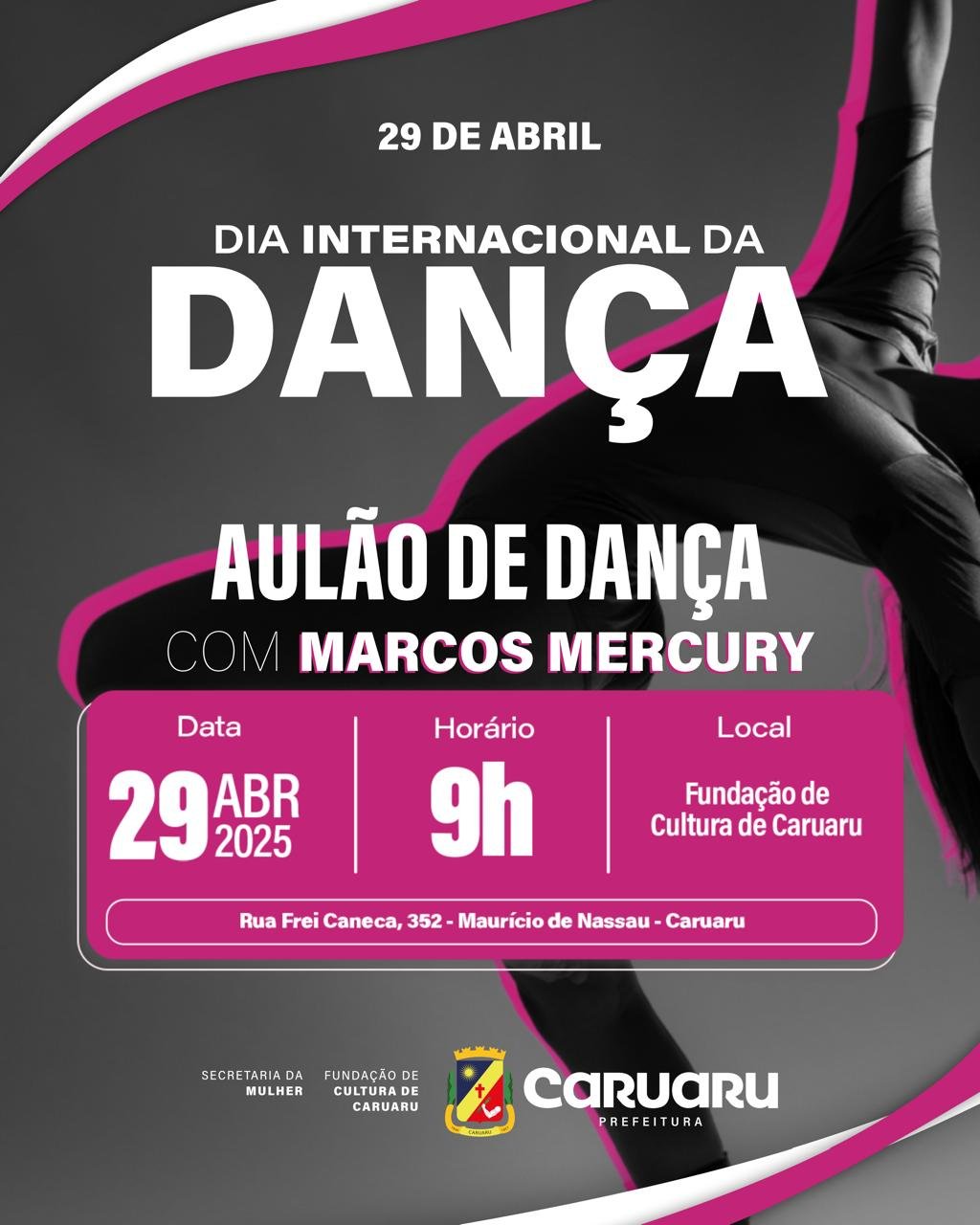 Caruaru receberá, nesta terça-feira (29), uma programação especial em comemoração ao Dia Internacional da Dança. O evento acontecerá a partir das 9h, na entrada da Fundação de Cultura, com aulão gratuito e apresentações artísticas do grupo Senhora Juventude.
