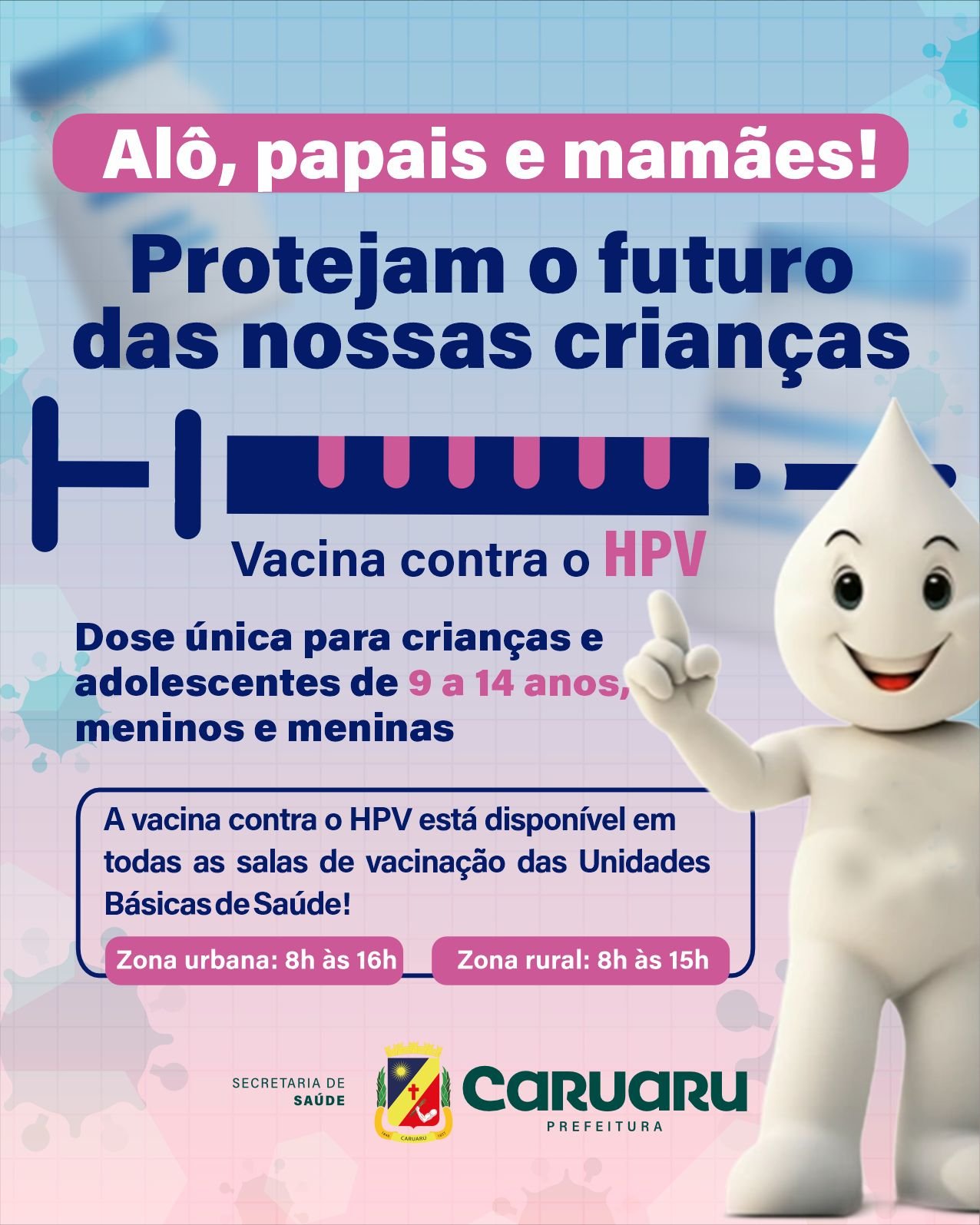 A vacina contra o HPV é essencial para a proteção contra diversos tipos de câncer, como o de colo do útero, garganta e ânus. O público-alvo são crianças e adolescentes de 9 a 14 anos, idade em que a resposta imunológica ao imunizante é mais eficaz. O esquema vacinal preconizado para este grupo é dose única. Os pais e responsáveis podem levar seus filhos para vacinar nos seguintes horários: na zona urbana, das 8h às 16h, na zona rural, das 8h às 15h.