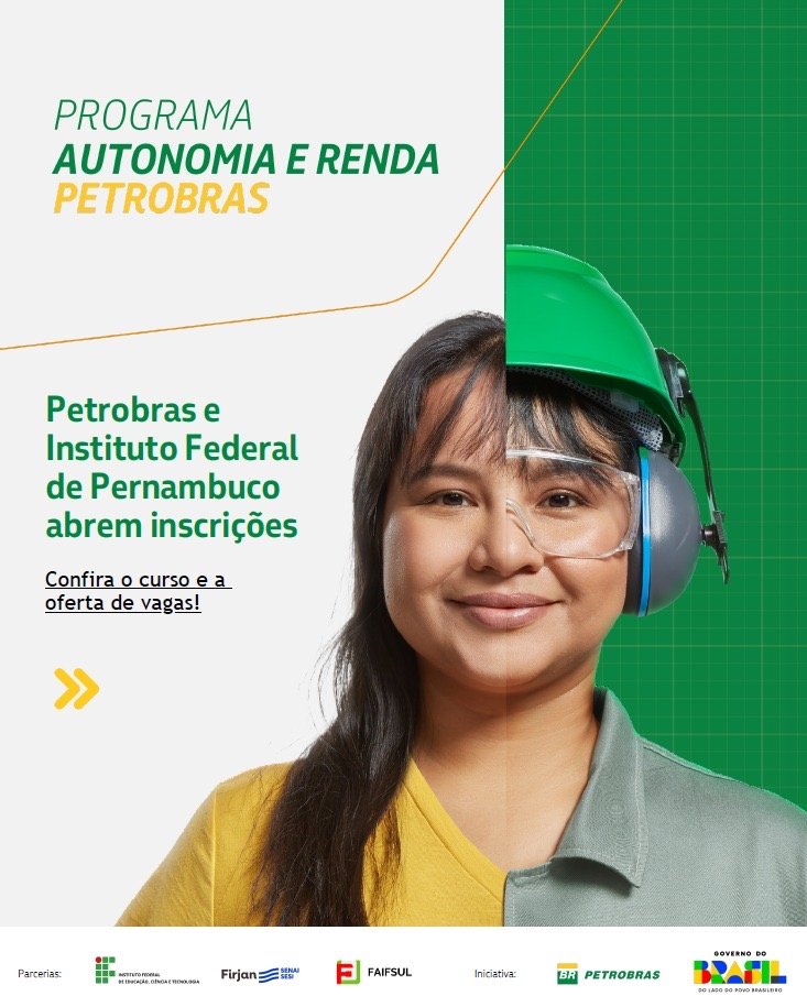 O Programa Autonomia e Renda Petrobras está com inscrições abertas, até 05 de janeiro de 2026, para cursos de qualificação profissional gratuitos que serão realizados em Caruaru em parceria entre a Petrobras e o Instituto Federal de Educação, Ciência e Tecnologia de Pernambuco (IFPE). *São duas turmas de “Montador de Andaimes”, uma de “Eletricista Industrial”, uma de “Mecânico Montador de Máquinas” e uma de “Soldador”*, somando quase 160 vagas.