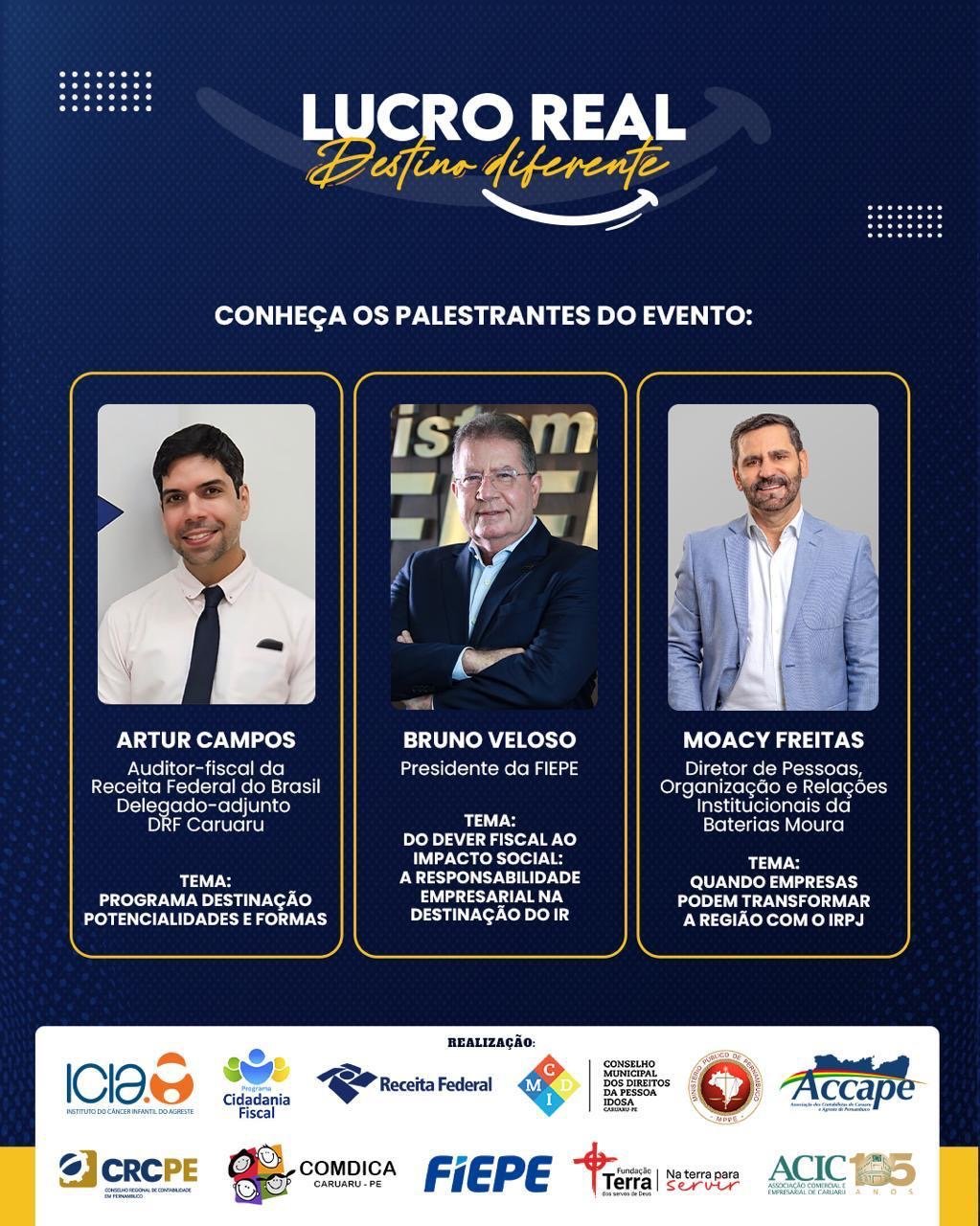 1. Arthur Campos – Auditor-fiscal da Receita Federal do Brasil e Delegado-adjunto da DRF Caruaru, que abordará o “Programa Destinação, potencialidades e formas”, explicando como funciona a destinação tributária do IRPJ, seus limites, requisitos e os fundos beneficiados.