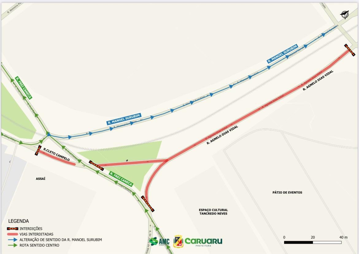 O fluxo de veículos, que antes seguia pela rua Agnelo Dias Vidal, passará a ser desviado pela rua Manoel Surubim, sentido Centro/Subúrbio. A alteração no fluxo de veículos do local ficará em vigor até o fim do São João de Caruaru.