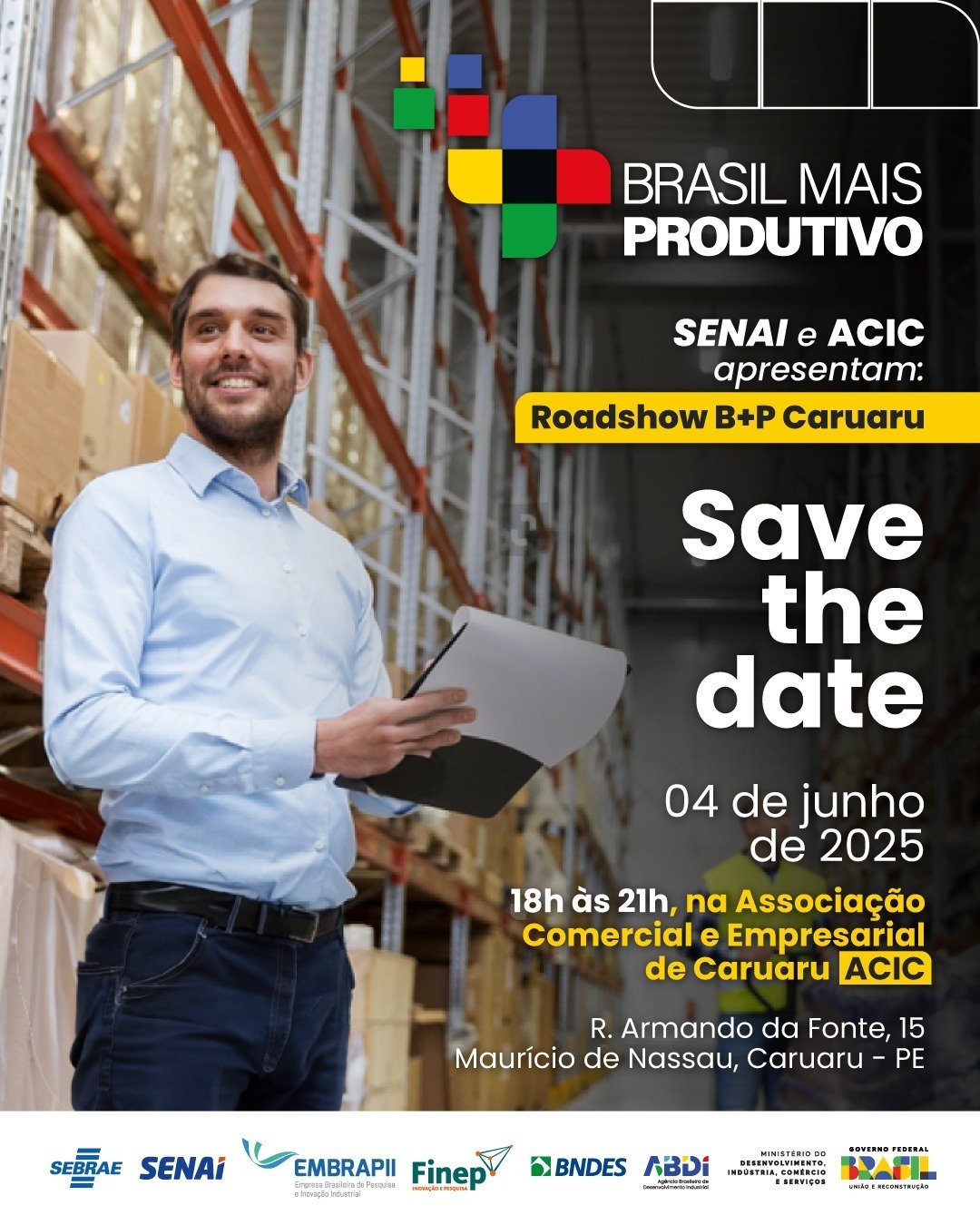 No dia 04 de junho, a partir das 18h, no auditório da Associação Comercial e Empresarial de Caruaru (Acic), o SENAI-PE e o Sebrae/PE irão realizar o Roadshow do Brasil Mais Produtivo, programa do Ministério do Desenvolvimento, Indústria, Comércio e Serviços (MDIC) que vai destinar R$ 2 bilhões para o engajamento de 200 mil empresas até 2027, com atendimento direto a 93,1 mil. O evento tem como objetivo divulgar o programa e as oportunidades oferecidas para os empresários. As inscrições devem ser feitas através do link: https://mkt.pe.senai.br/brasil-mais-produtivo.