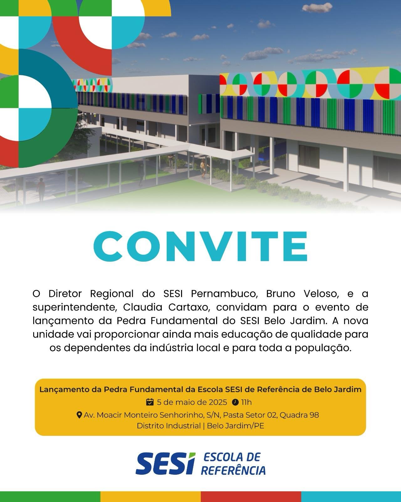 Belo Jardim será a próxima cidade a ser contemplada com uma Escola de Referência do Serviço Social da Indústria (SESI) em Pernambuco. Na próxima segunda-feira (05), a partir das 11h, será realizado o lançamento da pedra fundamental da unidade, na Av. Moacir Monteiro Senhorinho, s/n, no Distrito Industrial, em uma solenidade para convidados e a imprensa. A obra, que terá o investimento de cerca de R$ 38 milhões, é mais um dos frutos da parceria do SESI Pernambuco com o Grupo Moura. O presidente da Federação das Indústrias do Estado de Pernambuco (FIEPE) e diretor regional do SESI Pernambuco, Bruno Veloso, e a superintendente, Claudia Cartaxo, estarão presentes.