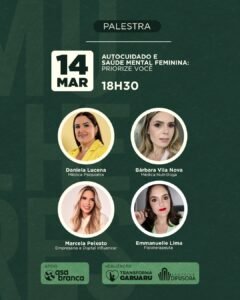Nos dias 13 e 14 de março serão realizados os workshops “O Poder da Mulher Protagonista: Construindo Carreiras e Histórias de Sucesso” e “Autocuidado e Saúde Mental Feminina: Priorize Você”, respectivamente.