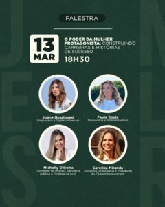 Nos dias 13 e 14 de março serão realizados os workshops “O Poder da Mulher Protagonista: Construindo Carreiras e Histórias de Sucesso” e “Autocuidado e Saúde Mental Feminina: Priorize Você”, respectivamente.