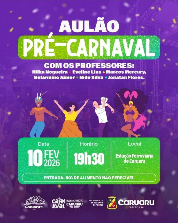 Com essa proposta, a Prefeitura de Caruaru, por meio da Secretaria Executiva de Esportes, realiza, nesta terça-feira (10) o Aulão de Dança Pré-Carnaval, um encontro que une exercício físico e a energia contagiante das músicas carnavalescas. A atividade começa a partir das 19h30, na Estação Ferroviária de Caruaru. A entrada será solidária, mediante a doação de 1kg de alimento não perecível, que será destinado ao Transforma Caruaru.