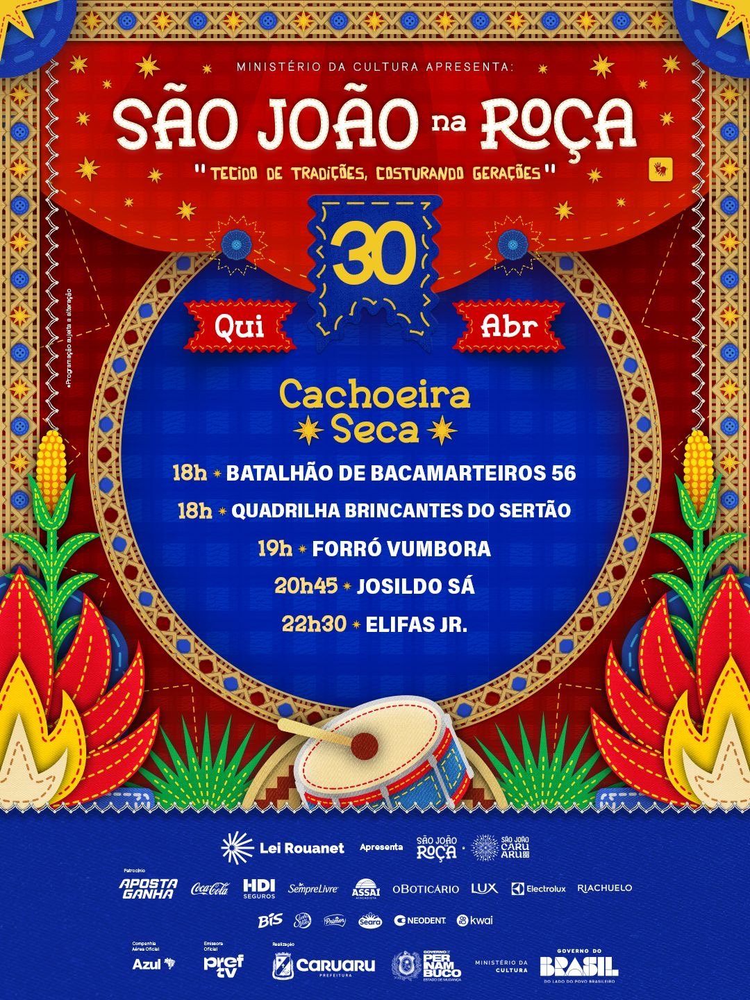 A programação completa do São João na Roça pode ser conferida no Instagram oficial do São João de Caruaru: instagram.com/p/DWEf2Wzjp2A/?igsh=N3M1NzRndDJxb2hpam