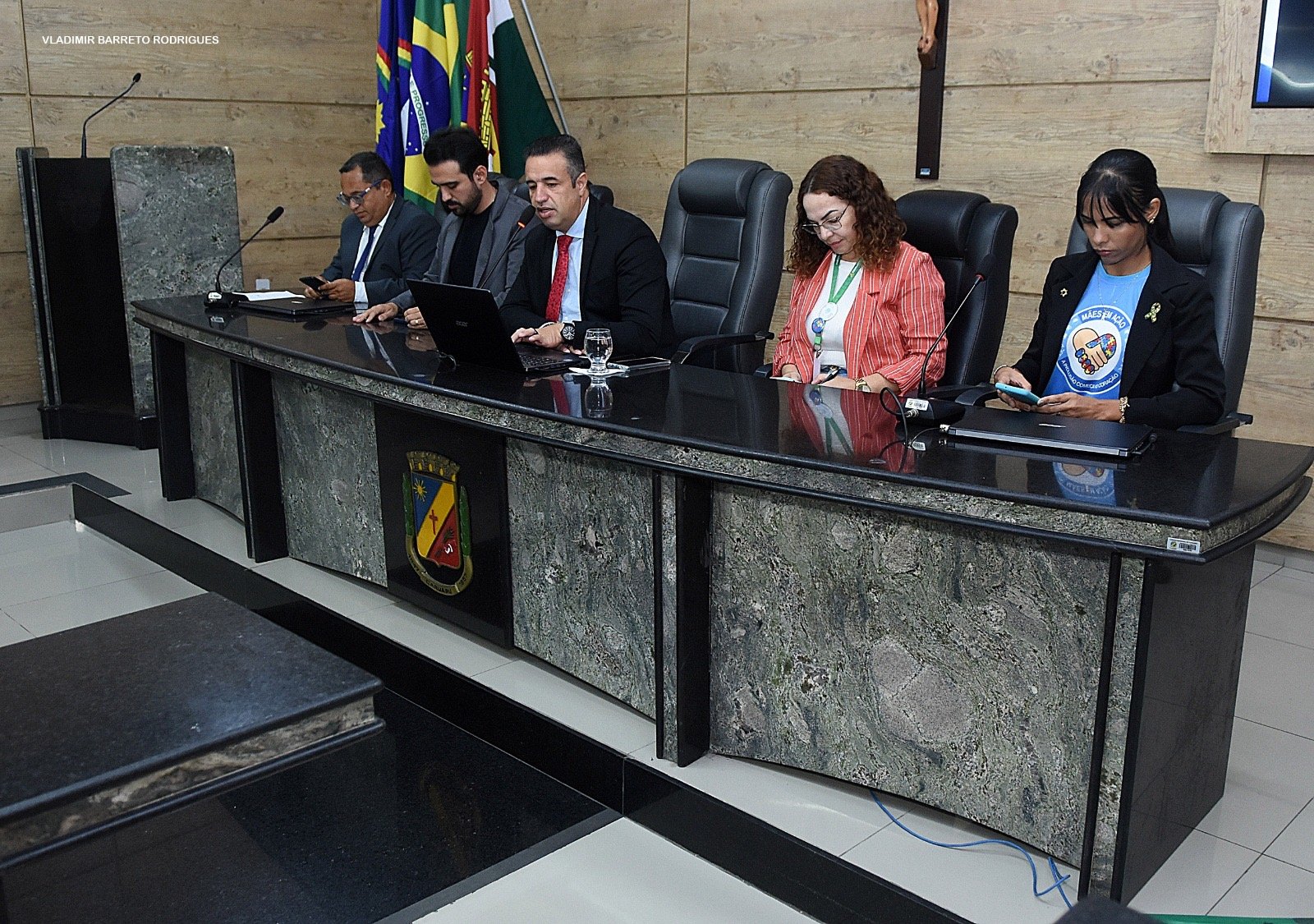 A mesa de honra foi composta pelo presidente da Casa, Bruno Lambreta (PSDB); pelo vereador propositor, Gil Bobinho; pelo secretário de Educação e Esportes, Kaio Colaço; pela gerente do Núcleo TEA da Secretaria de Saúde, Janaína Valéria; e por Louisiane Delgado, presidente do grupo Mães em Ação. Também estiveram presentes representantes de setores ligados à assistência social e à defesa dos direitos da criança e do adolescente do município, como também o vereador Delegado Lessa (Republicanos).