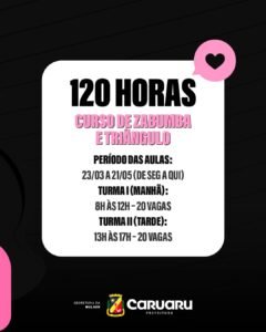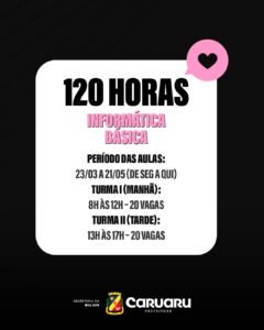 As aulas acontecerão de 23 de março a 21 de maio, de segunda a quinta-feira, com turmas nos turnos da manhã (8h às 12h) e tarde (13h às 17h). Cada turma conta com 20 vagas disponíveis.