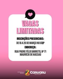 As inscrições devem ser realizadas presencialmente, entre os dias 16 e 20 de março, no Centro de Qualificação Profissional, localizado na Rua Padre Félix Barreto, nº 71, no bairro Maurício de Nassau.